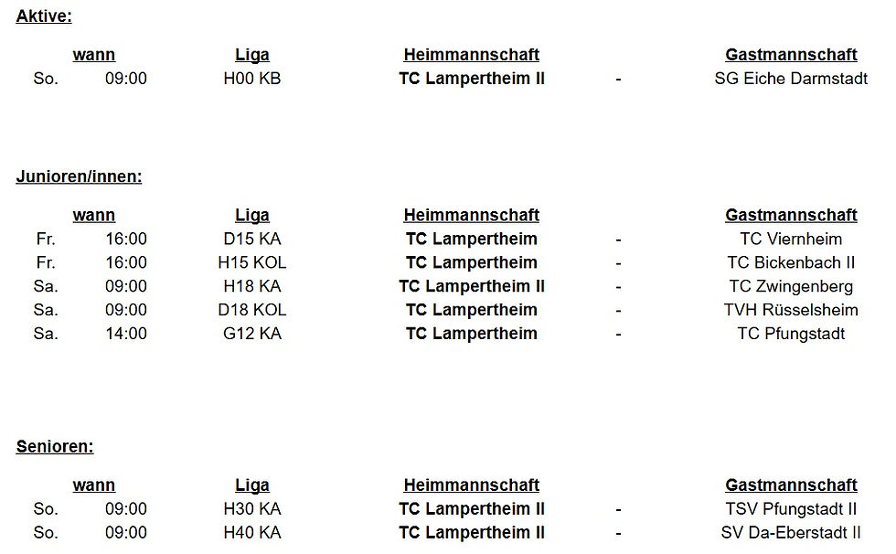 am kommenden Wochenende finden wieder zahlreiche Medenspiele auf unserer Anlage statt. Unsere aktiven Mannschaften, Juniorinnen und Junioren sowie Senioren freuen sich über eure Unterstützung!